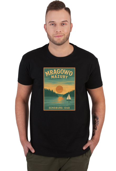 ..zachód słońca nad mazurskim jeziorem, zarys sosnowego lasu i żaglówka, a wszystko w klimacie pocztówki z lat 50. Złote promienie odbijają się w turkusowej wodzie, a dopisek „Sensburg 1348” przypomina o średniowiecznych korzeniach Mrągowa. Koszulka dla tych, którzy kochają Mazury, vintage estetykę i chcą nosić lokalną historię na klacie – idealna na letni spacer, festiwal czy żeglarski wypad.